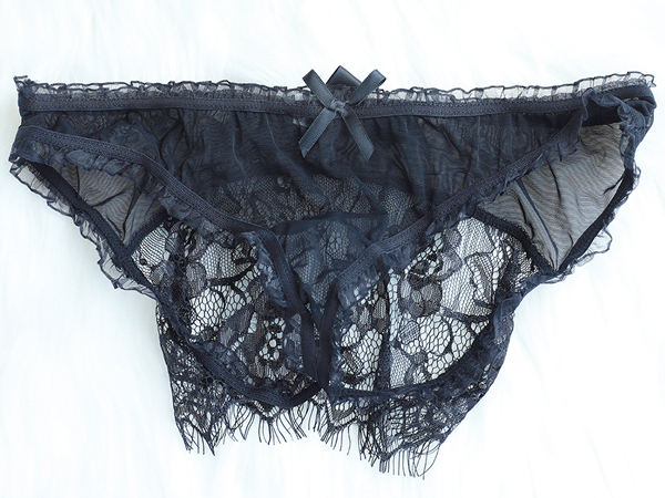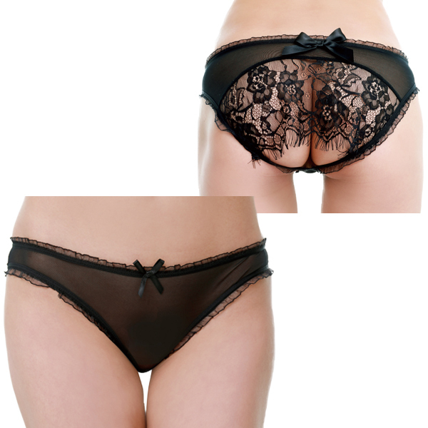 フロントはちょっと大人しめなデザインながら、バックスタイルで挑発するキュートな透明感が楽しめる刺繍デザインが魅力のプレイショーツ。ブラックのシースルー生地をベースに、フリルを使ったトリミングやリボンの装飾がカワイイ感じを演出してくれるフルバックタイプのショーツで、フロントとバックの印象が大きく違う二面性が楽しめます♪大きくラウンドカットされたヒップサイドには大きめなサテンリボンと、優雅なフローラルレースで装飾され、かなり大胆なデザインになっています!※刺繍などのデザインが異なる場合がございます。濡れたままの保管は色移りの原因になります。