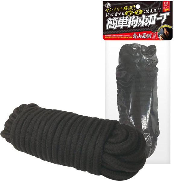 初心者でも簡単♪ソフトSMにぴったりな綿素材を使用した緊縛ロープ「簡単拘束ロープ 黒」。●身体に負担をかけない綿素材●柔らかく適度にコシのある仕上がり●様々なプレイを実現する長さ10m●使用後は洗濯も出来て衛生的●緊縛師「青山夏樹」推薦。緊縛プレイでマンネリ解消!緊縛事故防止の教育・啓発を行うNPO法人BDSMセーフティーサポート協会代表の女緊縛師「青山夏樹」推薦!安心・安全に使用できるSMグッズです。※本商品は吊りへの使用は出来ません。