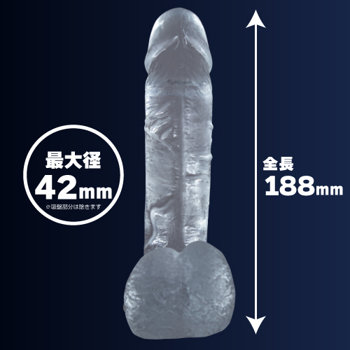 先っぽから根元までずっぽりと太く真っ直ぐ奥まで届く「クリアディルド(Lサイズ)」。ストレート形状で大きなカリ、そして程よい弾力が特徴で、平均的な日本人サイズのペニスでは体験できない快感が味わえるのが自慢です♪太く、まっすぐ向き合う太い俺!透明ディルドで吸盤付きで、挿入感がたまらないので太さと大きさを求めている方におすすめです♪